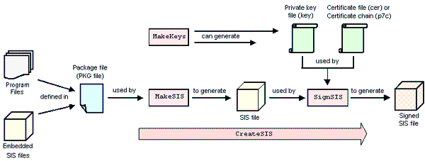 CreateSIS tool at the command prompt to generate and sign the installation file. Specify the trusted certificate-key pairs as arguments, as shown in the following example:createsis create -cert trustedchain.pem -key eecertkey.key mypackage.pkg