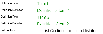 A definition list is used when a number of items need to be defined or explained. The list is made up of two columns. The first column is a sequence of terms to be defined; the second is a sequence of definitions. The terms are quite short, and cannot be more than a single paragraph. The definitions are potentially long, containing multiple paragraphs. The table of list types above, for instance, would be a natural use of a definition list.