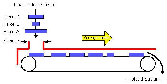 Parcel A is too big to get through the aperture and is discarded. Parcel B, arriving shortly after A will fit through the aperture but as there is another parcel already on the conveyer parcel B has to wait. As the conveyor belt slowly moves to the right eventually enough space opens up to fit parcel B on the conveyor. Parcel C however has to wait behind parcel B, and it has to wait longer than B did for enough space to open up to allow C to fit.