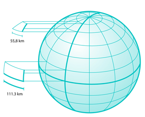 Figure: Length difference between latitude lines on the equator and at 60 degrees of latitude