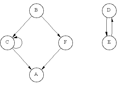 vertex set: A B C D E F edge set: (B,C) (B,F) (C,A) (C,C) (D,E) (E,D) (F,A) out-edges: A --> B --> C F C --> A C D --> E E --> D F --> A