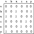 An adjacency-matrix representation of a graph is a 2-dimensional V x V array. Each element in the array auv stores a Boolean value saying whether the edge (u,v) is in the graph. Figure 3 depicts an adjacency matrix for the graph in Figure 1 (minus the parallel edge (b,y)). The ammount of space required to store an adjacency-matrix is O(V2). Any edge can be accessed, added, or removed in O(1) time. To add or remove a vertex requires reallocating and copying the whole graph, an O(V2) operation. The adjacency_matrix class implements the BGL graph interface in terms of the adjacency-matrix data-structure.