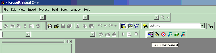 EPOCToolbar This makes available a Symbian OS-specific toolbar in your Microsoft Developer Studio IDE. As can be seen below there are