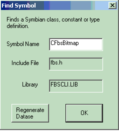 Find Symbol, For any Symbian OS C++ identifier you want to make use of, find immediately the header you need to include and the lib you