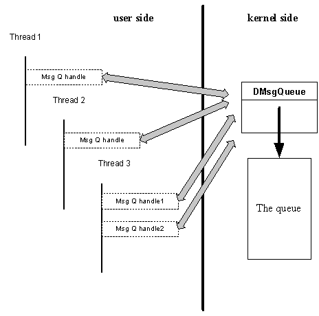 As a queue can be accessed by any number of readers and writers, the general picture is as shown here, where Msg Q handle