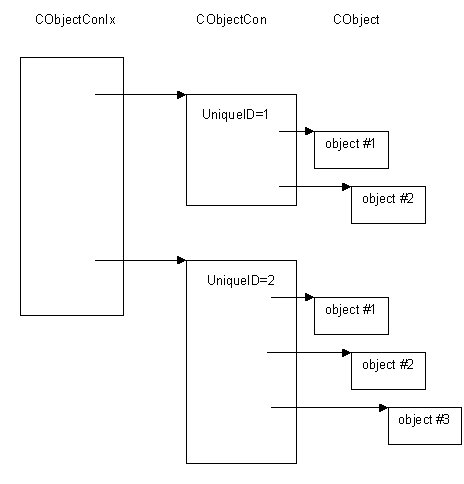 For example, the Kernel creates a single object container index; from this it creates a number of object containers, each of which, in turn, holds reference counting objects. The following drawing shows the idea.