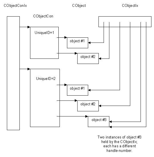 An object index can hold reference counting objects which belong to different object containers. The same reference counting object can also be added to an object index any number of times; each is regarded as a different instance of that object and each instance generates a different handle-number.