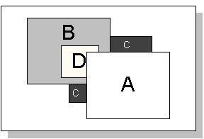 If window A is now moved to the front, window B moves behind it, as shown in the diagram below. Window D’s ordinal position is still 0, but because its position always remains relative to its parent window, it moves with window B to behind window A.
