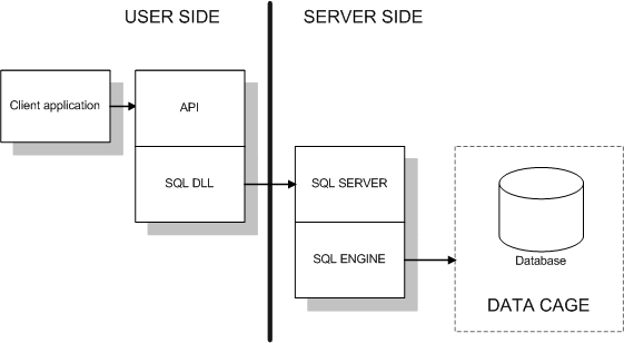 The server side is an executable running in its own process and incorporates an SQL engine. The server is not directly acessible to client applications, and it can only be reached via the client-side DLL.