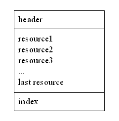 The resource file is generated from text input using the resource compiler. The index can be used to efficiently find a resource given its numeric id. There can be from 1 to 4095 resources in a resource file. Each resource contains binary data whose length is determined by subtracting the start position of the resource from the start of the next resource (or from the start of the index, for the last resource in the file).