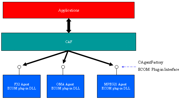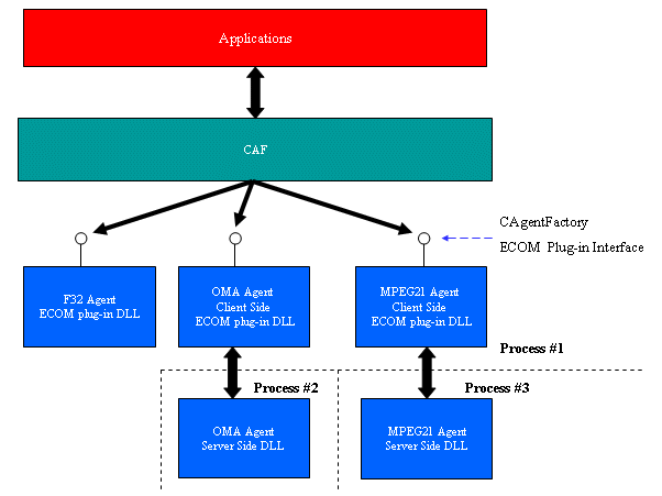 The following diagram illustrates the implementation of CAF with two fictitious agents (OMA and MPEG).