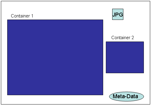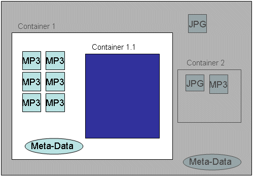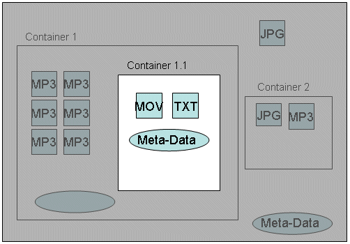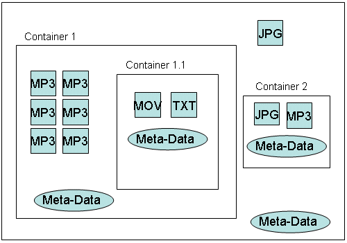 An example content file is given below. It has a number of content objects and a number of containers with other containers and content objects inside. It is likely that each container will have information or meta-data related to the collection of objects it holds.