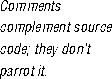 Commentsaren't a replacement for reading the code; source code should be as readable as possible. However, the source code isn't capable of representing all information concerning a subtle implementation. If source code isn't completely obvious, include a comment.